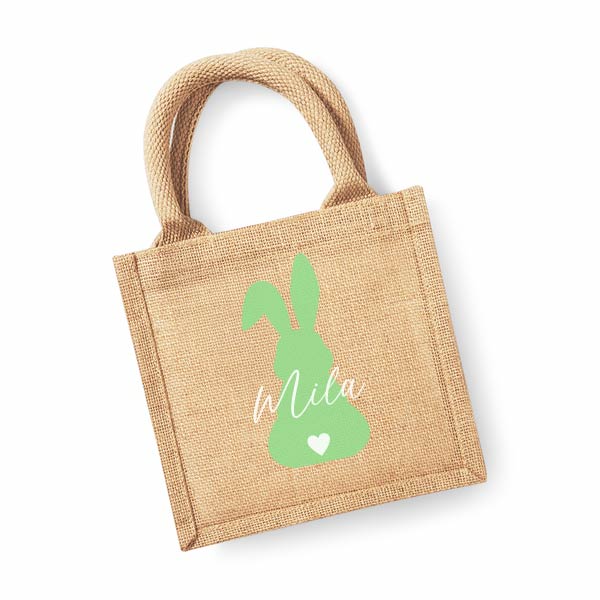Mini jute tas met konijntje. Perfect om paaseitjes te verzamelen of cadeau te geven. Personaliseer met een naam voor een uniek en persoonlijk resultaat!